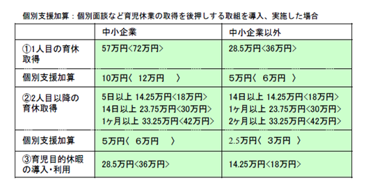 男性労働者が育児休業や育児目的休暇を取得しやすい職場風土作りに取り組み、子の出生後8週間以内に開始する連続 14 日以上(中小企業は連続 5 日以上)の育児や育児目的休暇を取得させた事業主に一定額が助成されます。