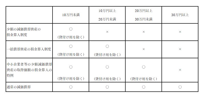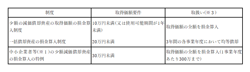 減価償却資産を取得した場合、通常は耐用年数に基づいた償却計算により損金算入が行われるが、少額資産については短期的に損金算入を認める制度が設けられています。