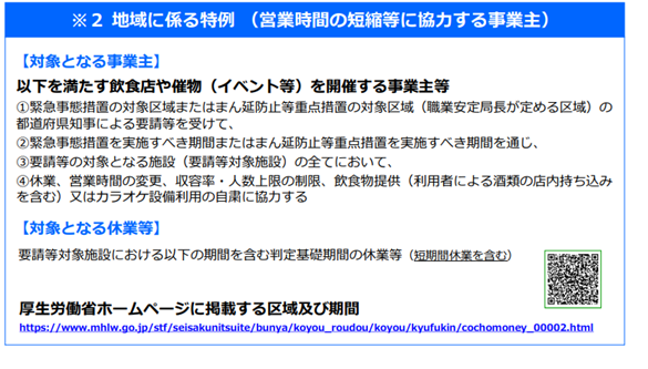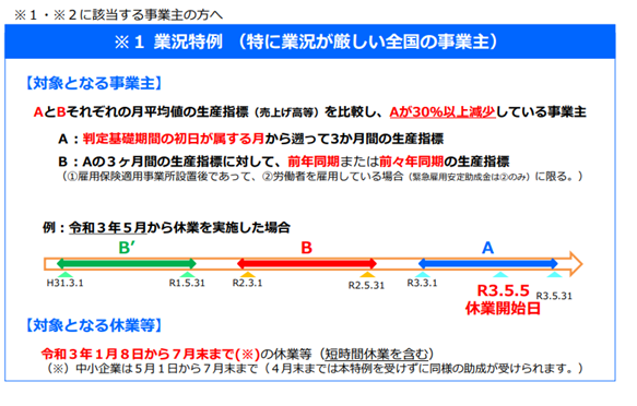 新型コロナウイルス感染症の拡大に影響を受け、特に業績が厳しい事業主が対象となる特例です。こちらの特例は全国の事業主を対象としています。