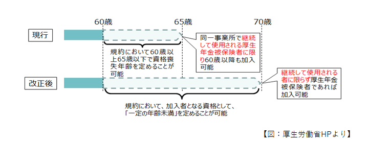今回の改正によって、厚生年金被保険者(70歳未満)であれば企業型確定拠出年金の加入者とすることができるようになりました。ただし、上限年齢はそれぞれの企業が規約で定めるので、会社の方針によって従来通り「60歳到達まで」や「65歳到達まで」を上限に設定することも可能です。