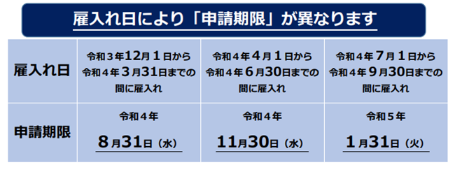 ②令和3年12月1日~令和4年9月30日まで雇い入れを行い、雇い入れ日から3カ月を経過するまで継続して雇用をしている。