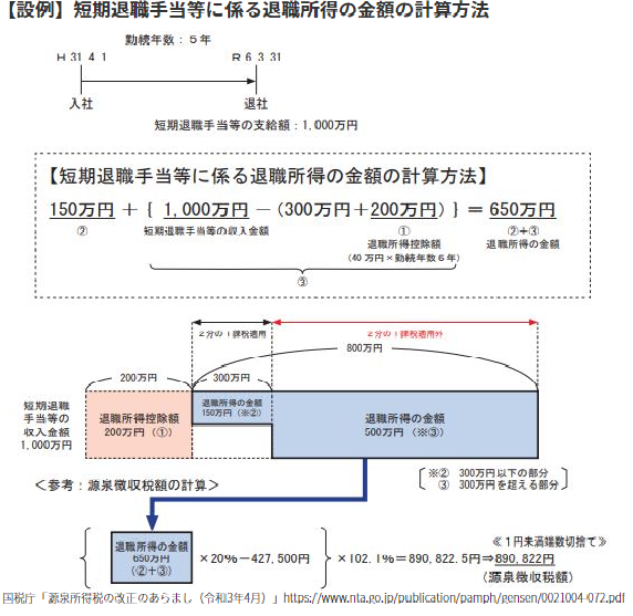 短期退職手当等に係る退職所得の金額の算定上、いわゆる2分の1課税が行われる範囲が制限され、令和4年分以後の所得税(源泉徴収に関しては令和4年1月1日以後に支払うべき退職手当等)について適用されることとされました。
