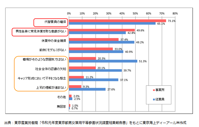 事業所と従業員の両方を対象とした「男性の育児休業取得にあたっての課題」についての調査結果が下記となります。