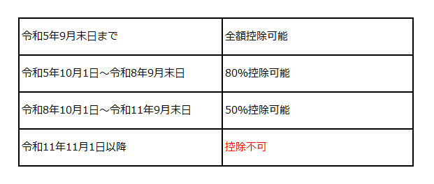 消費税免税事業者からの課税仕入については以下の通り、インボイスがない場合でも仕入税額控除が可能な経過措置が設けられています。