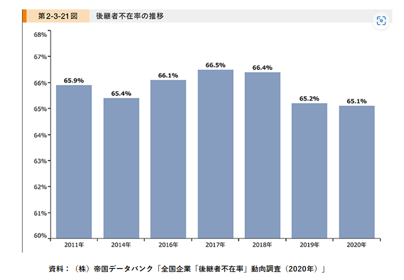 帝国データバンクのデータによると、2020年時点で60%以上の事業者が後継者不在であるというデータがあります。また、少子高齢化の進展により、従来主流であった親族内承継をしようにも後継者が見つからない事業者が増えていることも、後継者不足が解決されない一因となっています。