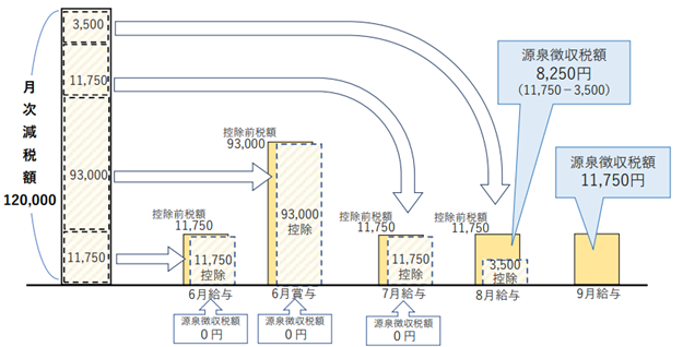 最初に支払う6月給与の源泉所得税が11,750円の時、まずは6月給与で控除をします。控除しきれなかった分を以後に支払う6月賞与、7月給与、8月給与…と順次控除していき、控除し終えると従来の方法で源泉徴収税額を算出します。