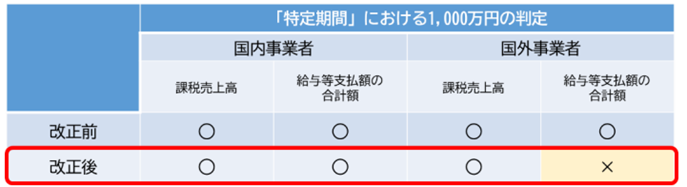 この改正により、国外事業者については「特定期間」における1,000万円の判定を、給与等支払額の合計額により行うことができなくなり、「特定期間」における課税売上高が1,000万円を超える場合、給与等支払額の合計額にかかわらず、納税義務は免除されません。
