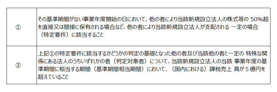 基準期間がない法人で、その事業年度開始の日における資本金の額又は出資の金額が1,000万円未満の法人(新規設立法人)のうち、次の①、②のいずれにも該当するもの(特定新規設立法人)については、当該特定新規設立法人の基準期間のない事業年度に含まれる各課税期間における課税資産の譲渡等について、納税義務が免除されません。