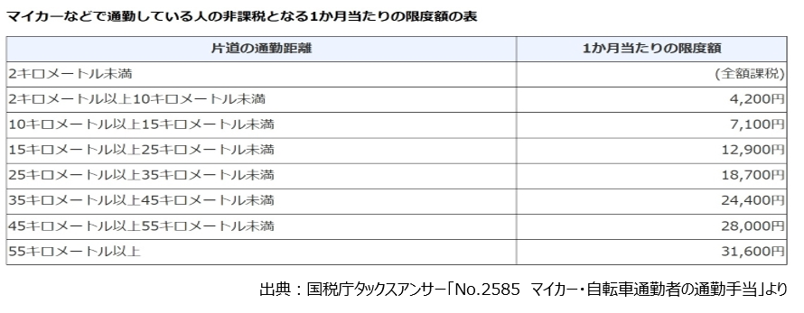 マイカー・自転車などを使用して、通勤している人の非課税となる1か月当たりの限度額は、片道の通勤距離(通勤経路に沿った長さ)に応じて、次のように定められています。