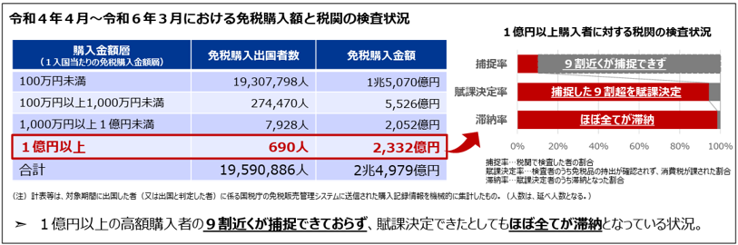 特に1億円以上の高額購入者の多くについては税関検査の結果、国外への持ち出しが確認されず、消費税の課税処分を受けています。さらにこれらの者の大半は納税資金を持ち合わせておらず、その多くが滞納したまま海外へ出国している状況です。