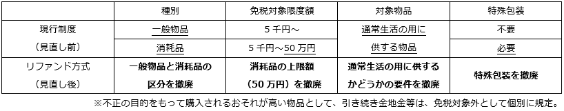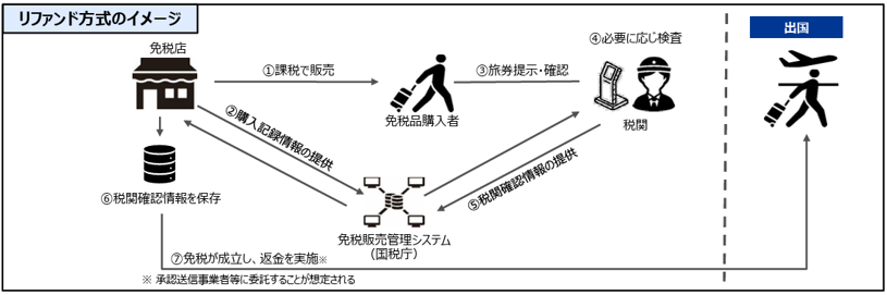 出国の際に免税対象物品の持ち出しが確認された場合に免税販売が成立する制度とし、免税販売の成立後に免税店から免税購入対象者に対し消費税相当額を返金するリファンド方式に見直すこととされました。