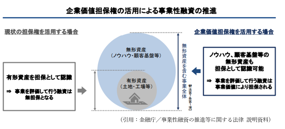 大きなポイントが「企業価値担保権」という新たな担保枠組みで、これは、企業が持つ無形資産(ブランド力・技術・顧客基盤・ノウハウなど)も含め、事業全体の価値を担保として評価するという仕組みになります。