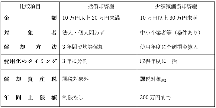 取得価額が10万円以上20万円未満の減価償却資産について、それぞれの耐用年数で減価償却せず、3年間で均等に損金算入する特例制度です(本稿では、主に法人税の取扱いを前提として「損金算入」という表現を用いています)。